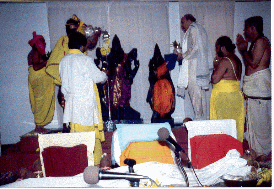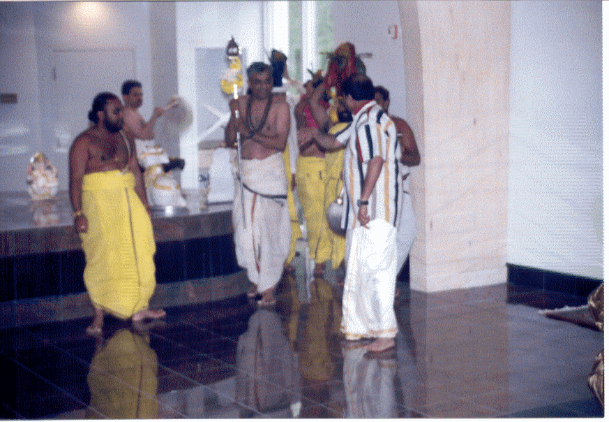 Kumbha Pooja – Performed by Dayton Temple Priest Ramesh Rajamani (seated in the middle of the right row)) and Cincinnati Temple Priest Srinivas Bhattar (seated 1st from the deity platform in the right row). During this event, Murugan Deity was placed in the main hall in the middle area against the north wall (Neither wing had been built yet).